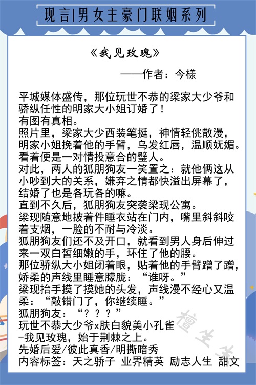小短评:男女主家是世交,两家祖辈就订下儿女亲事,由于上一辈没有女孩,婚事就落在了这一辈头上。按理说是女主姐姐和男主家的结亲事的概率更大,但女主姐姐有心上人就寻死觅活不肯,女主无奈应下。她以为是和男主残疾三哥结婚,结果纸醉金迷的太子爷男主亲自上阵了。两人以形婚模式相处了一年半,夫妻该干的事都干了,却一致认定没感情。女主是娱乐圈的十八线明星,长相妖艳经常莫名被黑,为了让她小火一把,经纪人给她接下了一档恋爱综艺,结果被男主知道了,男主心里又酸又气,这时才发现对女主的感情无法自控……文风搞笑的一篇文,结局如何,看书找答案吧!