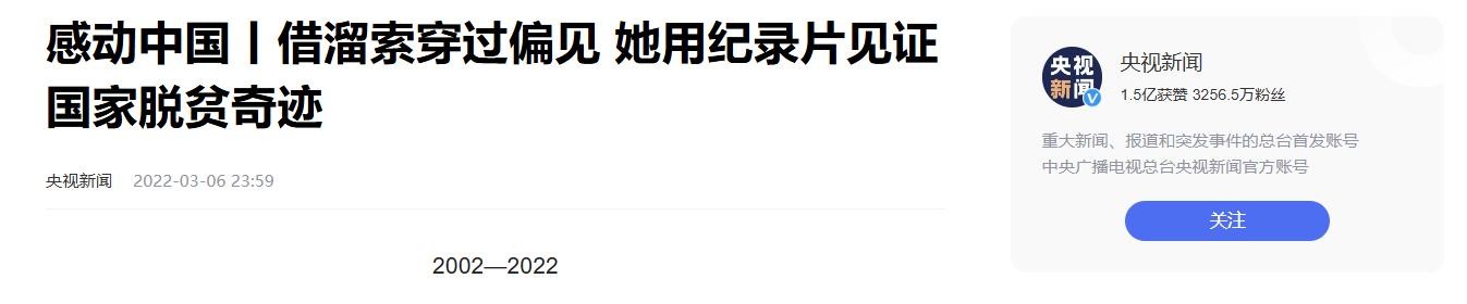 央视新闻 2022-03-06 23:59《感动中国丨借溜索穿过偏见 她用纪录片见证国家脱贫奇迹》