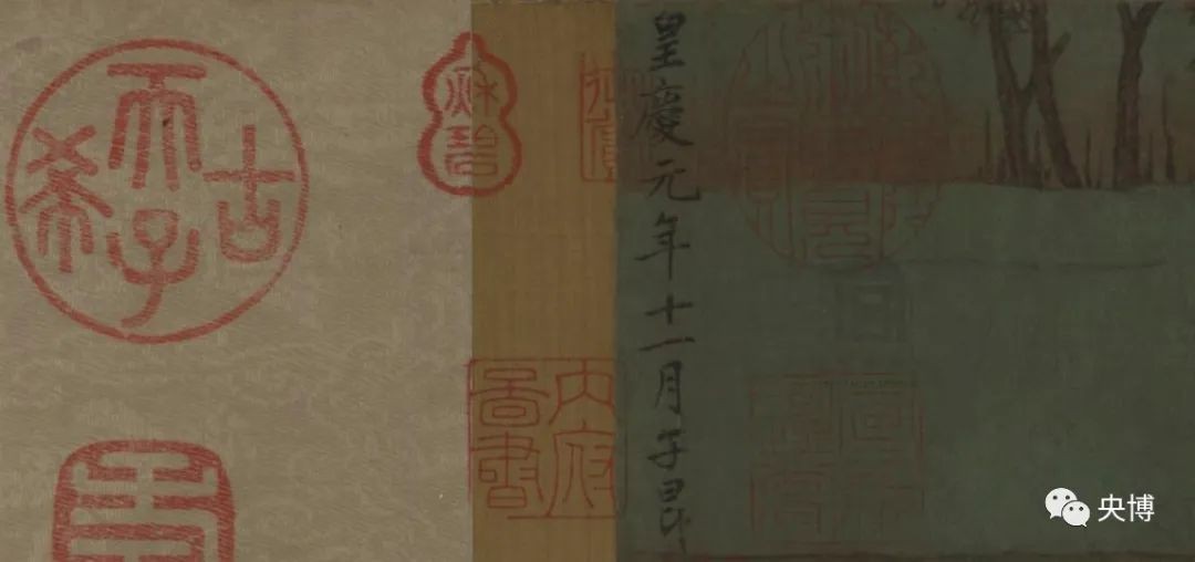 乾隆多次欣赏这幅画作,并于不同时候,盖上藏印。这张图左侧上方的印章是乾隆喜得玄孙时,于这幅画旁盖上“五福五代堂古稀天子宝”。