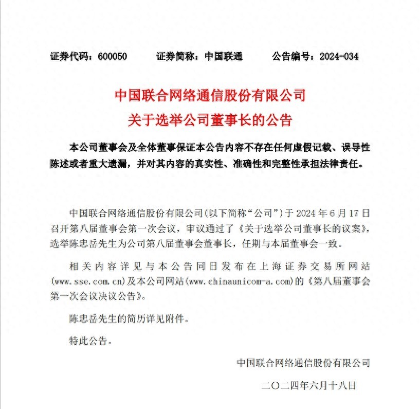 通信世界网消息(CWW)据中国联通6月18日公告,中国联合网络通信股份有限公司(以下简称“公司”)于2024年6月17日召开第八届董事会第一次会议,审议通过了《关于选举公司董事长的议案》,选举陈忠岳先生为公司第八届董事会董事长,任期与本届董事会一致。