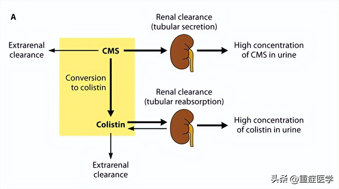 静脉给药后,很大一部分CMS主要通过肾小球滤过和肾小管分泌排出。由于在健康个体中,肾脏对CMS的清除率远高于其转化为粘菌素的清除率,因此不超过20%至25%的CMS剂量在体内水解成活性粘菌素。与CMS相反,粘菌素主要通过非肾途径消除,因为其广泛的肾小管重吸收。虽然粘菌素在尿液中排出很少,但由于CMS(由肾脏高度排泄)在尿路内转化为粘菌素,服用CMS后尿中粘菌素浓度可能相对较高。