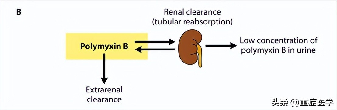与粘菌素相反,多粘菌素B以其活性抗菌形式直接施用。多粘菌素B受到非常广泛的肾小管重吸收,因此主要通过非肾清除机制消除。