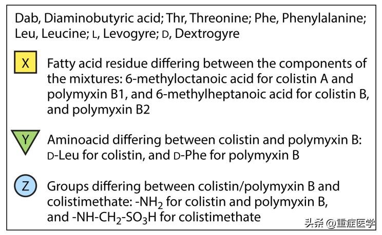 粘菌素和多粘菌素B在肽环上只有一个氨基酸的区别,多粘菌素B为苯丙氨酸,粘菌素为亮氨酸。多粘菌素B作为活性抗生素直接给药,而粘菌素以粘菌素甲磺酸盐(也称为粘菌酸盐[CMS])这种无活性的前药来给药。