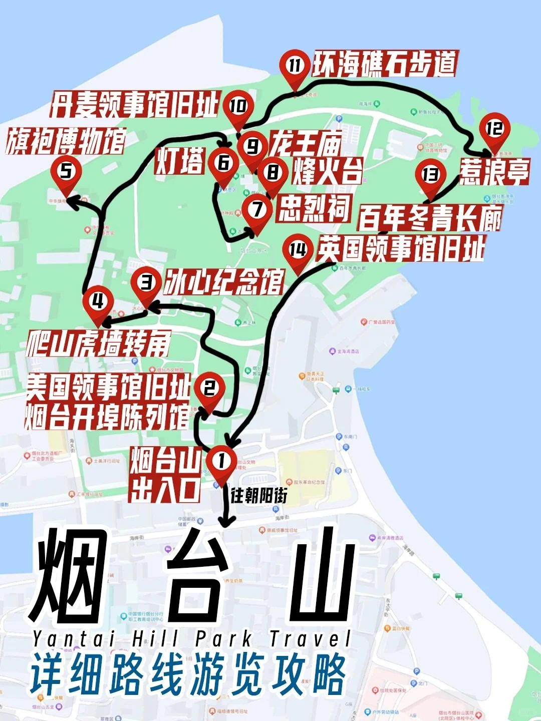 烟台山位于烟台市区,三面环海,拥有得天独厚的自然景观。山虽不高,但海景壮丽,是烟台市的地标性景点游览路线。