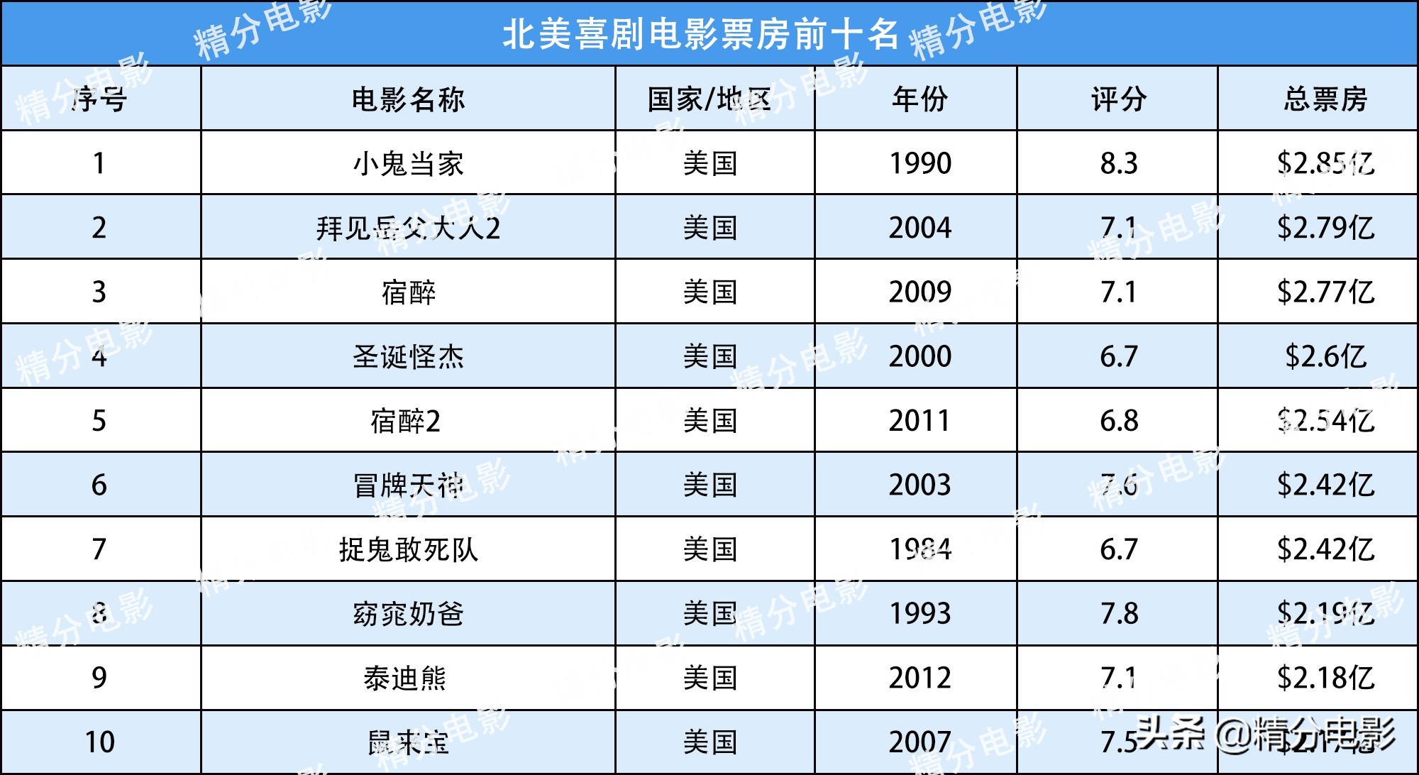 北美电影票房总排行,最卖座喜剧电影前10名,电影票房数据