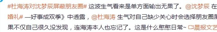 由于沈梦辰近期忙于工作,可能有些疏忽了对杜海涛的关心。杜海涛因此感到不满,一气之下,屏蔽了朋友圈,使其可见仅限共同好友。