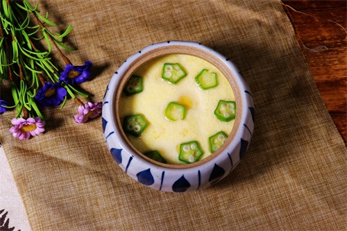 1,秋葵洗净焯水切成片,鸡蛋打入碗中,加入2倍的清水搅拌均匀,放上秋葵,盖上保鲜膜。