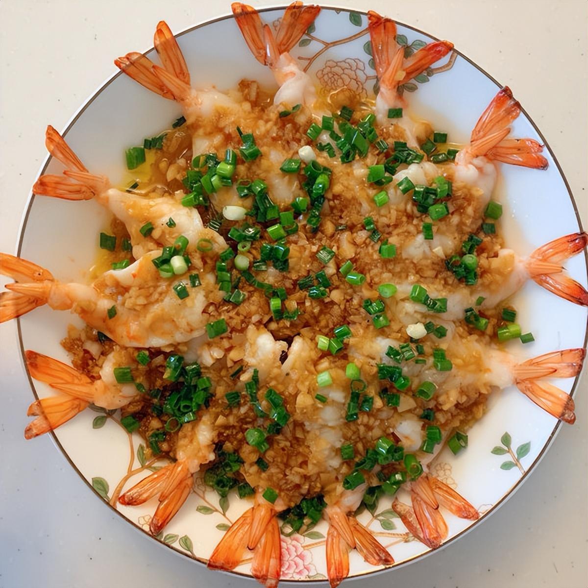 第7步、将炒好的蒜蓉淋入虾上,放入开水锅中。