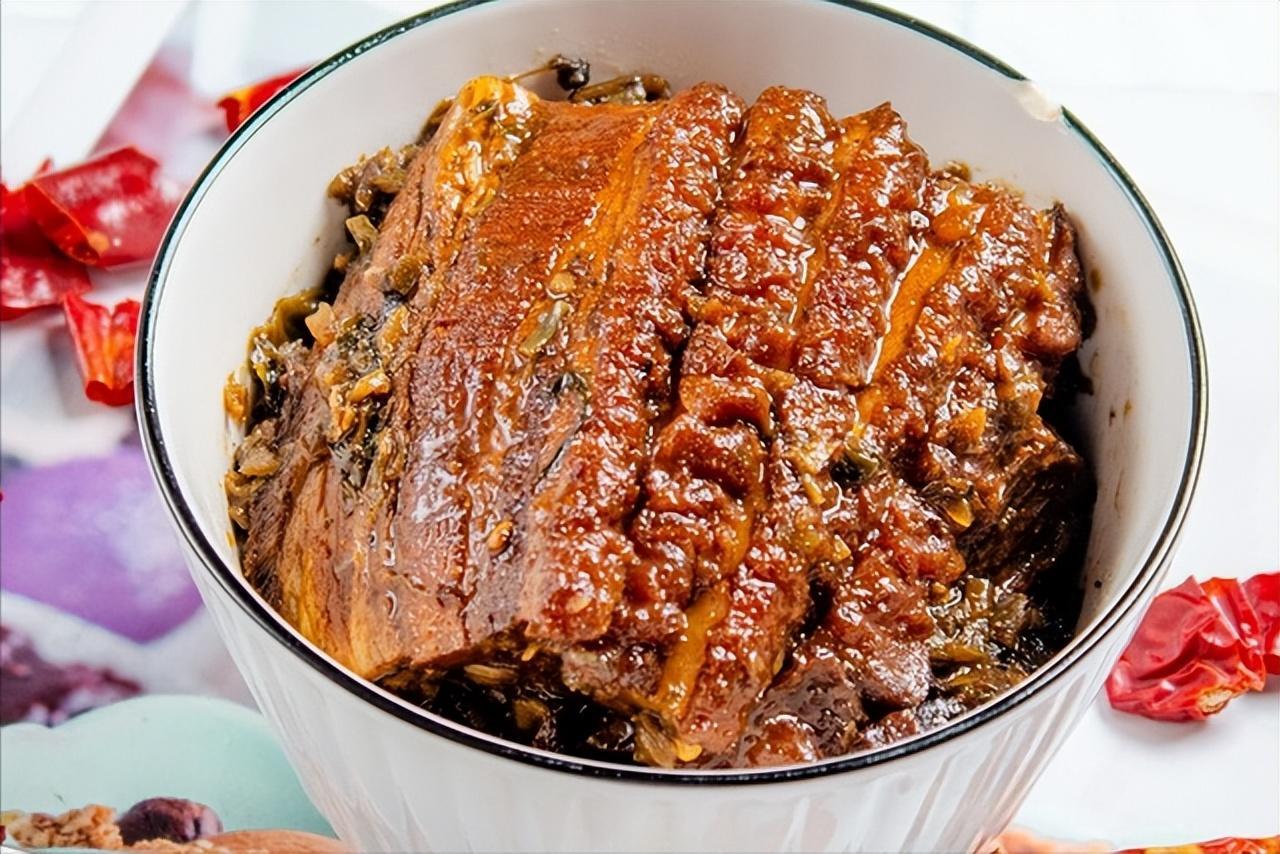 二,把梅干菜洗一下,洗净后用水泡发,下面我们把五花肉,整齐摆放在盘子里,然后放几个八角,随后再把梅干菜铺上去。锅内烧开水,放上去大火蒸1个小时左右,或者用高压锅更快,到时间之后取出来,倒扣在盘中即可。