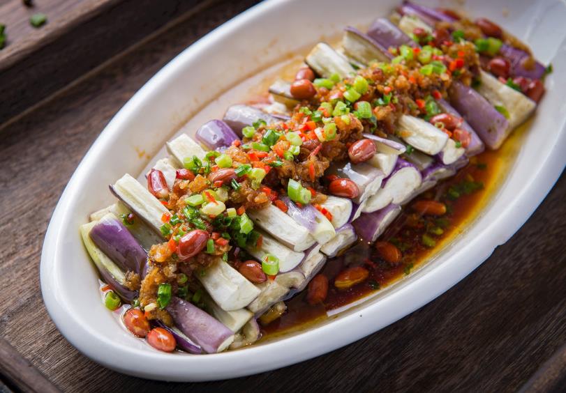 6、此时的茄子也蒸好了,准备一个盘子,待茄子稍微凉一点,小心取出,摆放到盘中,均匀地淋上料汁,蒸茄子就制作完成了。