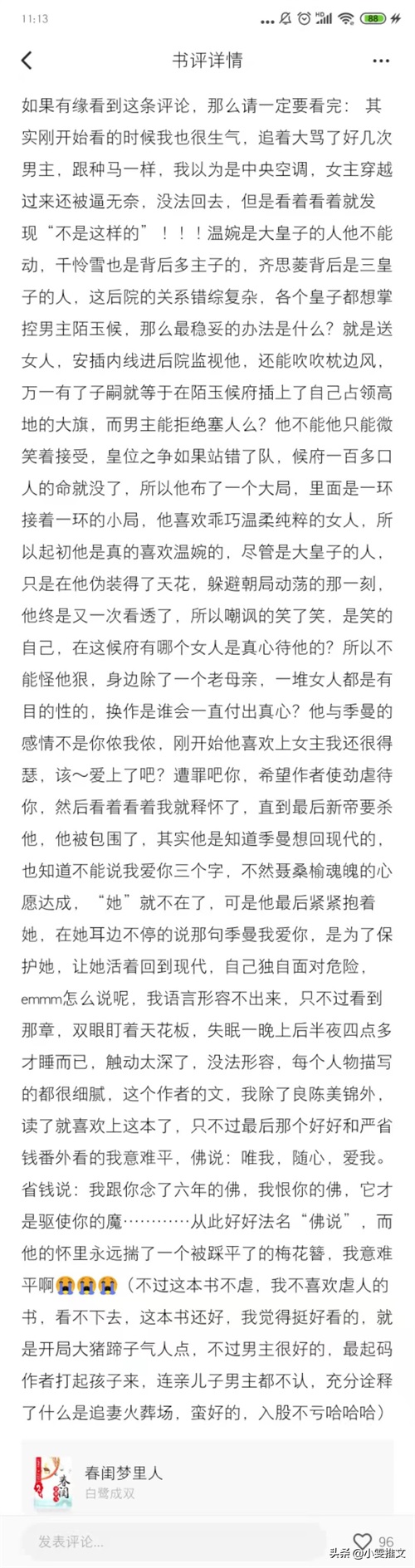 简评:这是一本渣男从良,浪子回头文;一般推荐,推荐原因就是想看男主追妻火葬场;不推荐原因就是男主前期真的很多女人,还让别人怀孕了;还有一个推荐原因就是其他cp挺好看的,我挺喜欢的,可惜写的不太多;捧月VS宁明杰;朱玉润VS千应臣;这些在番外有写;
