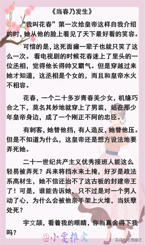 看了白鹭成双的《春日宴》,我爱上了这个作者,然后开始看白鹭成双的其他作品。发现他好多小说都挺好看的。下面推荐我看过的几本小说,个人觉得还不错;强烈推文《春日宴》《当春乃发生》,这两本我超级喜欢,都是甜宠基调。