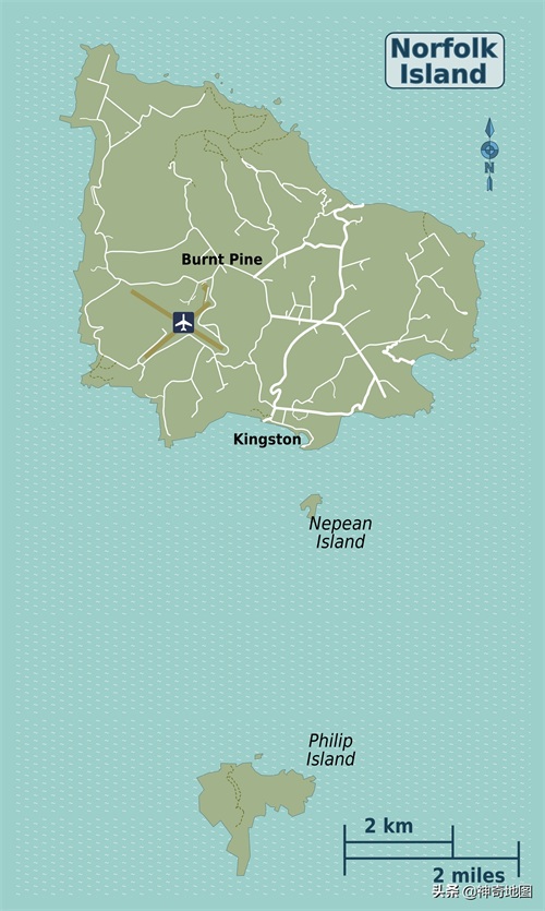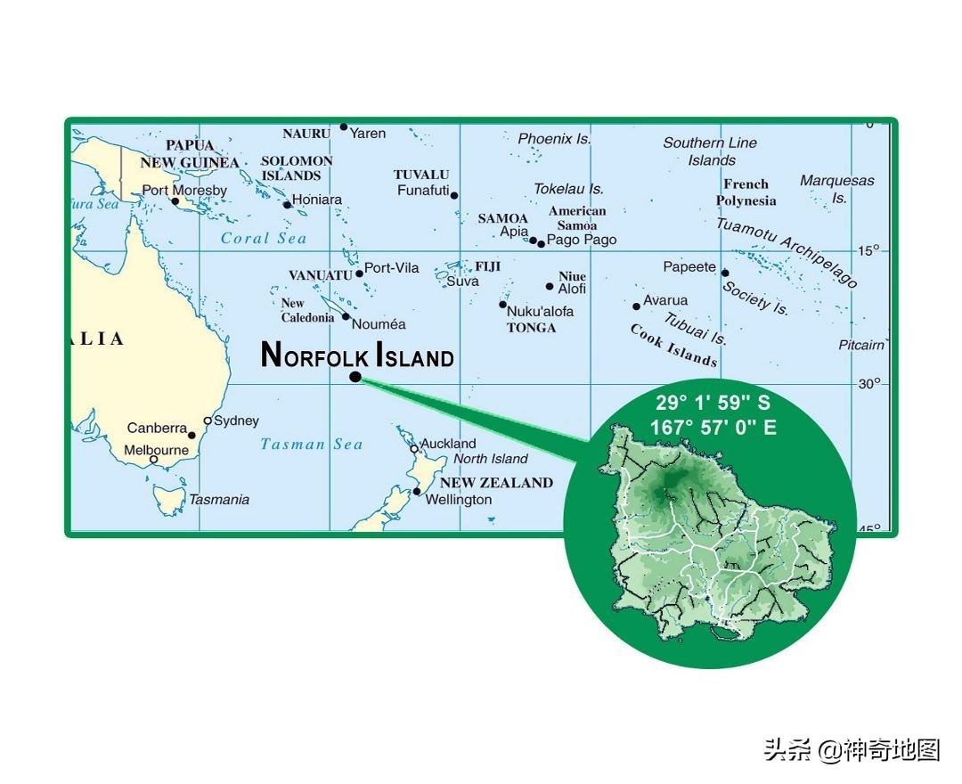 诺福克岛(Norfolk Island )位于澳大利亚和新西兰之间的塔斯曼海北部,是澳大利亚的一个自治领地。由一个稍大的火山岛--诺福克岛和附近两个小无人岛菲利普岛(Philip Island)和尼培恩岛(Nepean Island)组成,这里距离澳大利亚本土超过1500公里,距离新西兰600多公里。面积34.5平方公里,人口2000多,相当于中国西部的一个乡镇。