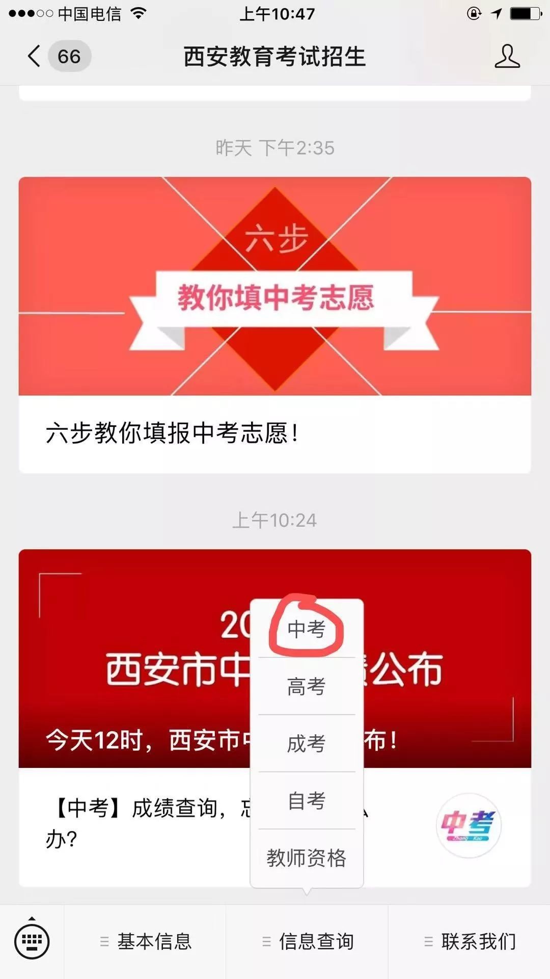 步骤:关注”西安教育考试招生“官微——进入公众号——点击”信息查询“——选择”中考“——输入输入准考证号、身份证号码查询。