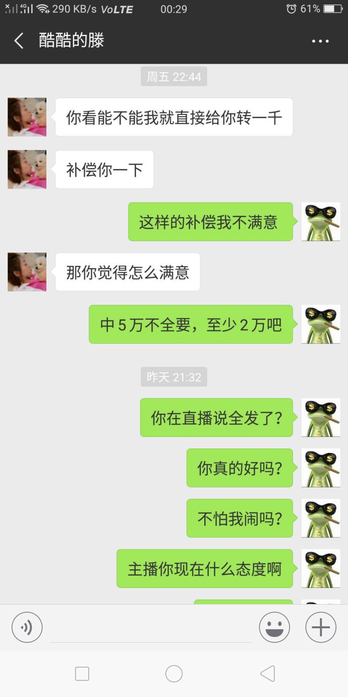 在该水友的爆料中,还放出了他与酷酷的滕聊天记录。一个拥有600多万粉丝的大博主,在数十万名观众的观看下竟然出尔反尔。50万秒变1000元,他的人民币汇率是50:1吗?