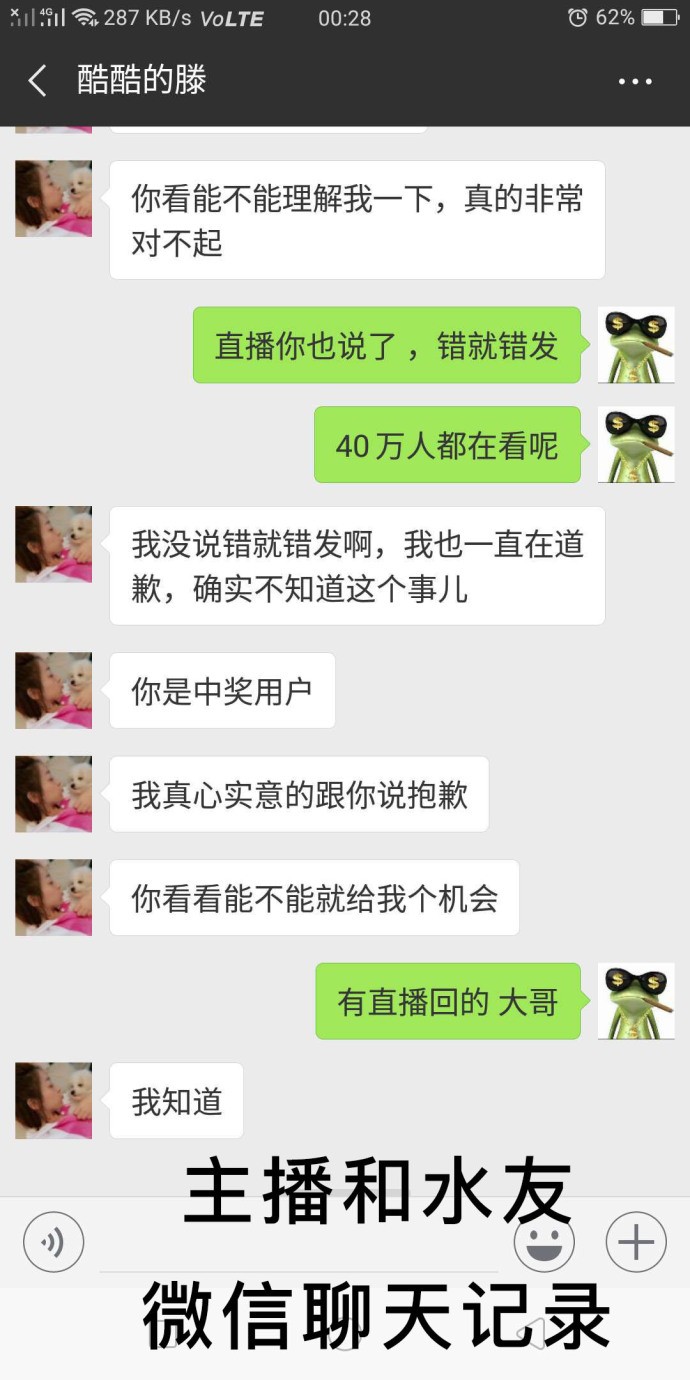 在与中奖水友聊天过程中,酷酷的滕还表示“理解一下”“能不能给我个机会”这是百万主播、六百万博主说出来的话吗???