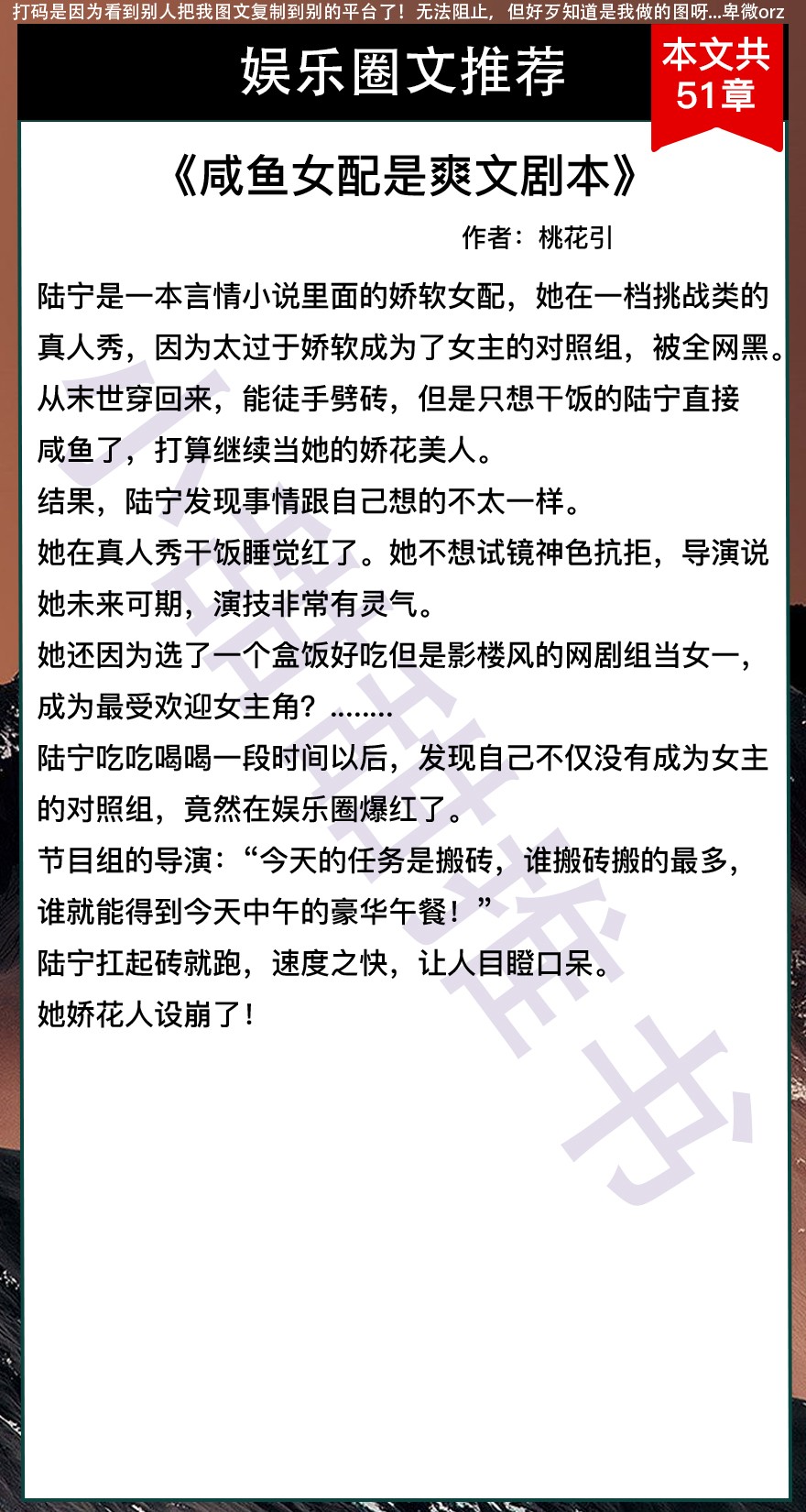 6本娱乐圈甜文推荐《咸鱼女配是爽文剧本》《我在综艺里嗑神颜》