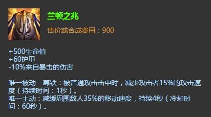 蓝顿可以增加护甲和500生命值,减缓敌人35%的移动速度,持续4秒,所以说出了一件板甲之后,第二件应该出蓝顿
