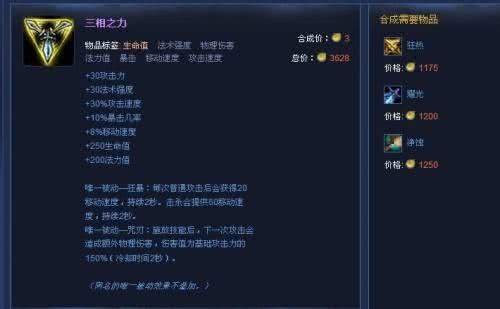 或者三相之力,三相和黑切都可以提升攻速,黑切可以穿甲,但黑切是每个AD战士几乎都会买黑切,所以作为天然肉盾,盖伦的优势就应该是抗性,所以在首装时应该出巨型九头蛇,这也是职业赛的打法,同事也是LOL官方推荐拦的装备