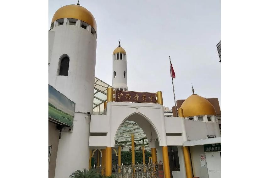 沪西清真寺占地达1125平方米, 由双心拱门扇形穹窿圆顶的二层礼拜殿的主体建筑与回廊相衔接, 其宣礼塔更是高达25米。 前院和后院都有彩色喷泉, 整体结构雄伟, 充满了现代阿拉伯伊斯兰建筑特色。