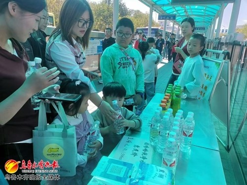 9月15日,记者来到BRT红山站点,在靠近充值点的空位摆着一个张桌子,上面放着矿泉水、饮料等。旁边立着一个牌子,上面写着:惠民服务点,无人值守,扫码自取。